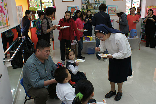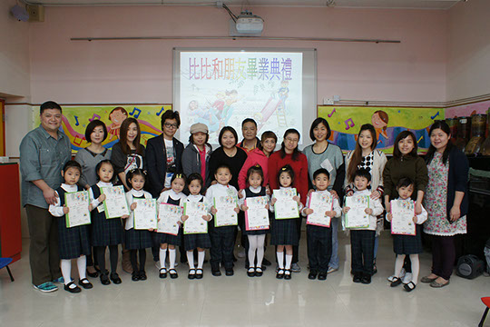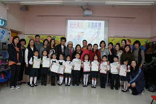 2014年3月26日(星期三)是《比比和朋友》的畢業典禮,當天我們更邀請家長一起參與幼兒最後一節的課堂,一起見證孩子的成長,透過相片及片段分享讓家長解課堂內容;活動中,由校長甘修女、葉主任及彭主任頒發證書給參與課程的學生,高班老師亦到來為孩子打打氣,家長更為孩子準備食物互相分享,一起為孩子的成長而慶祝,現在讓我們重溫這歡樂、溫馨的氣氛。
